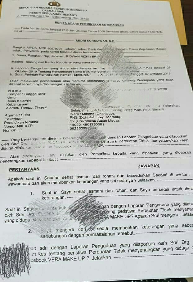 Surat Laporan EE ke Polres Meranti atas Pencemaran nama baiknya oleh akun FB bernama Vera make up