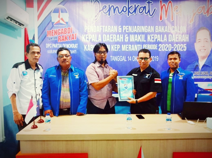Pengembalian formulir berkas pencalonannya sebagai Calon Wakil Bupati Kepulauan Meranti atau Meranti II (M2), Di serahkan oleh Ketua Tim pemenangannya yakni saudara Sapria Candra dan di terima langsung oleh Sekretaris DPC. Partai Demokrat Kabupaten Kepulauan Meranti yakni Agus Suliadi SH.