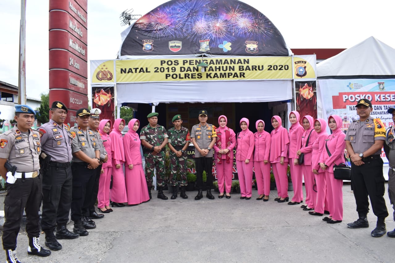 SIAK HULU. RIAUMADANI. COM - Kapolres Kampar AKBP Mohammad Kholid SIK bersama Ketua Cabang Bhayangkari Kampar Ny. Angela Kholid, kunjungi Pospam Operasi Lilin Muara Takus 2019 di Jalan Pasir Putih Desa Pandau Jaya Kecamatan Siak Hulu pada Selasa sore (31/12/2019).