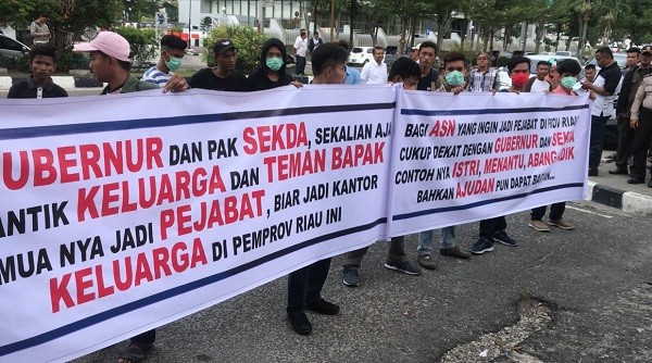 Mereka menduga, proses pelantikan pejabat eselon III dan IV beberapa waktu sarat nepotisme. Karena itu, massa mendesak Gubri membatalkan Surat Keputusan Nomor: KPTS.45/1/2019 tentang pemberhentian dan pengangkatan pejabat.