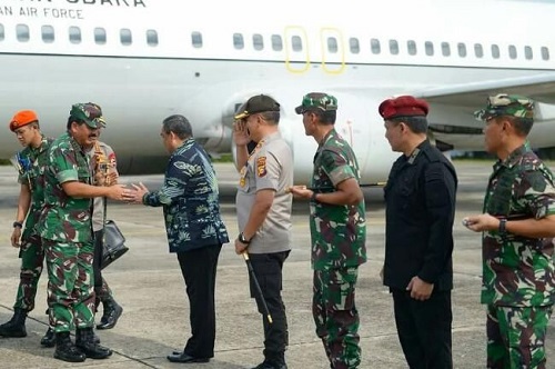 Kedatangan Panglima TNI dan Kapolri beserta rombongan disambut oleh Wakil Gubernur Riau Brigjen TNI (Purn) Edy Natar Nasution.