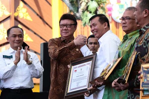 MenPAN-RB Tjahjo Kumolo juga menyerahkan piala dan piagam bagi gerai terbaik di MPP kepada Walikota Pekanbaru. DR. H Firdaus ST.MT