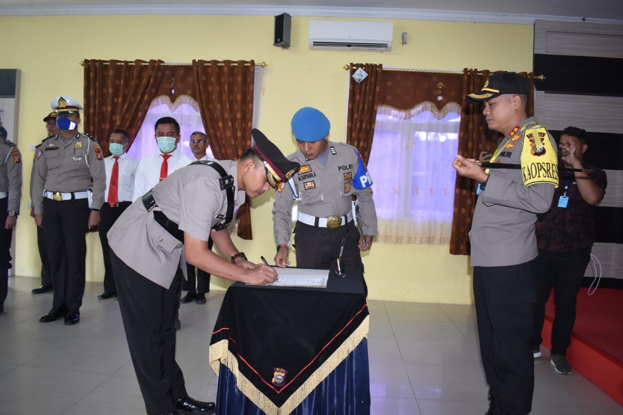 Selanjutnya dilakukan Penanggalan Tanda Jabatan Kabag Ops oleh Kapolres Kampar selaku Inspektur Upacara dan Penandatanganan Naskah Berita Acara Serah Terima Jabatan.