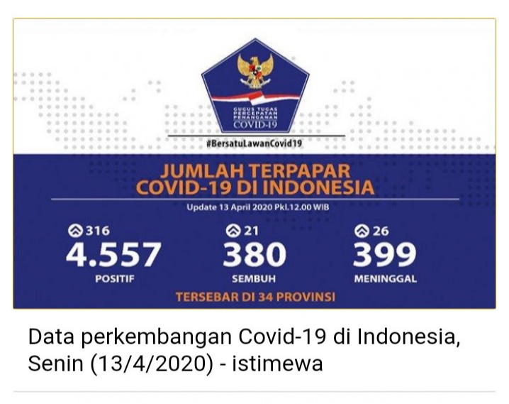 Terdapat tambahan kasus positif pada hari ini, Senin (13/4/2020) sebanyak 380 orang. Di antara tambahan data itu termasuk di Provinsi Riau yang jika ditotal menjadi 20 pasien positif.
