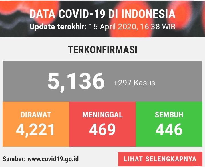 Berdasarkan data yang dihimpun sejak Selasa (14/4/2020) pukul 12.00 WIB hingga siang ini, Rabu (15/4/2020) pukul 12.00, ada penambahan 297 kasus Covid-19 di Tanah Air.