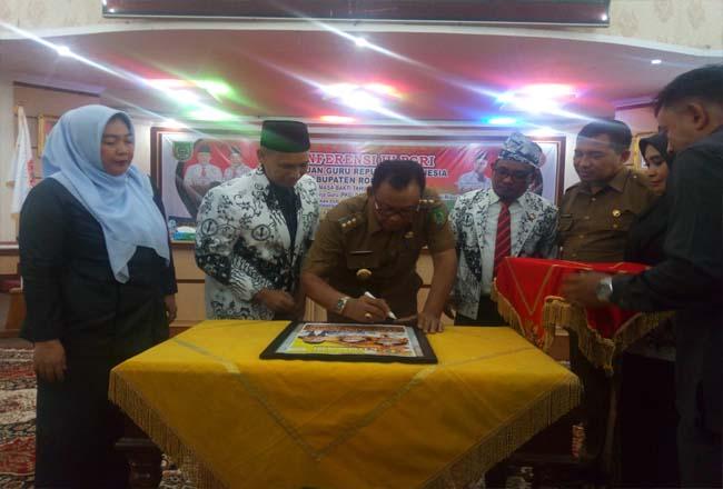 ROHIL. RIAUMADANI. COM - Bupati Rokan Hilir (Rohil), H Suyatno AMp membuka secara resmi Konferensi IV Persatuan Guru Republik Indonesia (PGRI) Rohil, Senin (9/3/2020) sore kemarin, di gedung pertemuan H Misran Rais. Ia berharap para guru mampu meningkatkan dan memajukan pendidikan di Negeri Seribu Kubah.