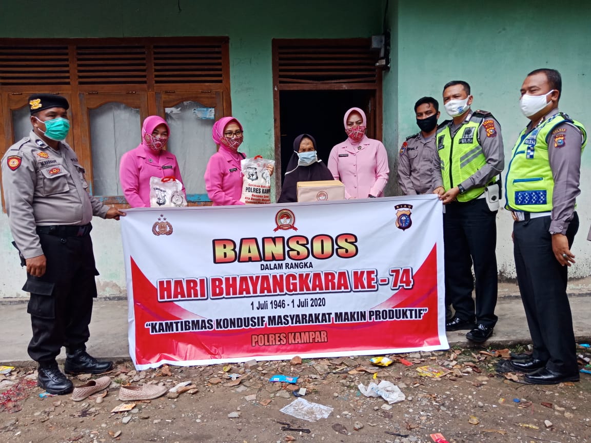 Ketua Bhayangkari Cabang Kampar Ny. Angela Kholid beserta beberapa pengurus, memberikan bantuan sembako untuk warga kurang mampu di Desa Batu Belah Kecamatan Kampar. Kamis siang (18/6/2020),