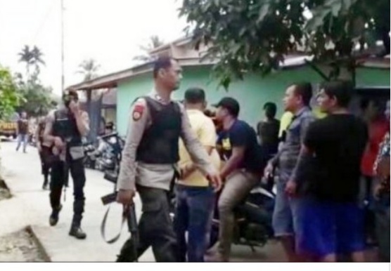 Terlihat sejumlah aparat berseragam lengkap datang sambil menenteng senjata Laras panjang.