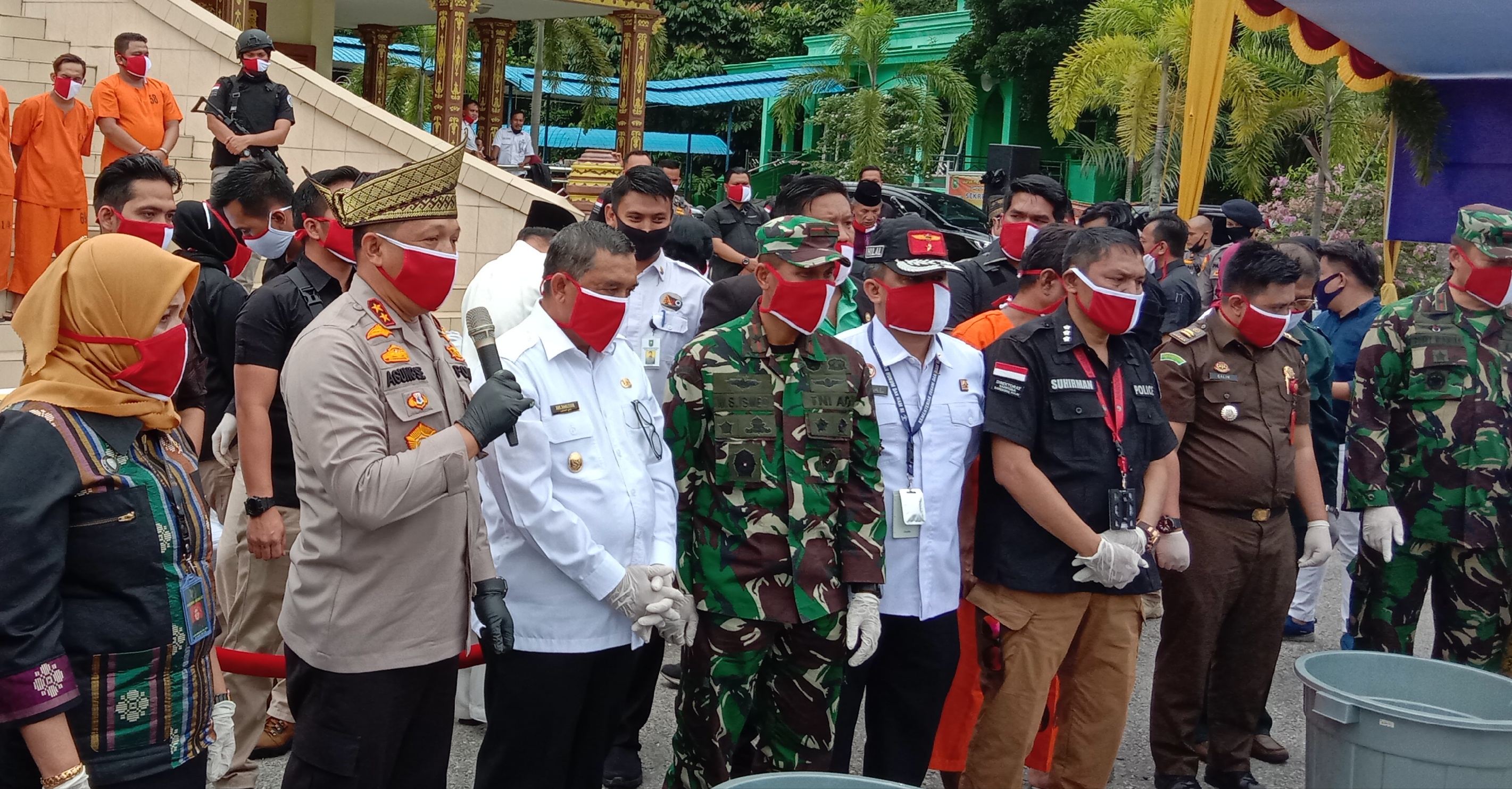 PEKANBARU. RIAUMADANI. COM – Polda Riau melakukan pemusnahan barang bukti Narkotika jenis shabu-shabu seberat 35,54 Kg dan 87, 64 Kg ganja beserta 540 Pil Ekstasi di halaman di kantor Lembaga Adat Melayu (LAM) Riau jalan Diponegoro Pekanbaru (24/06/2020)