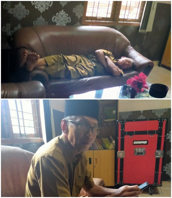 Dalam kesempatan itu dia menghubungi seseorang. Dalam sambungan telefon itu dia memberitahukan adanya wartawan yang mau meliput aksi tidur pulasnya tersebut. Lalu teleponnya itu dia sodorkan kepada media ini mengatakan ini pak kepala dinas mau ngomong!.