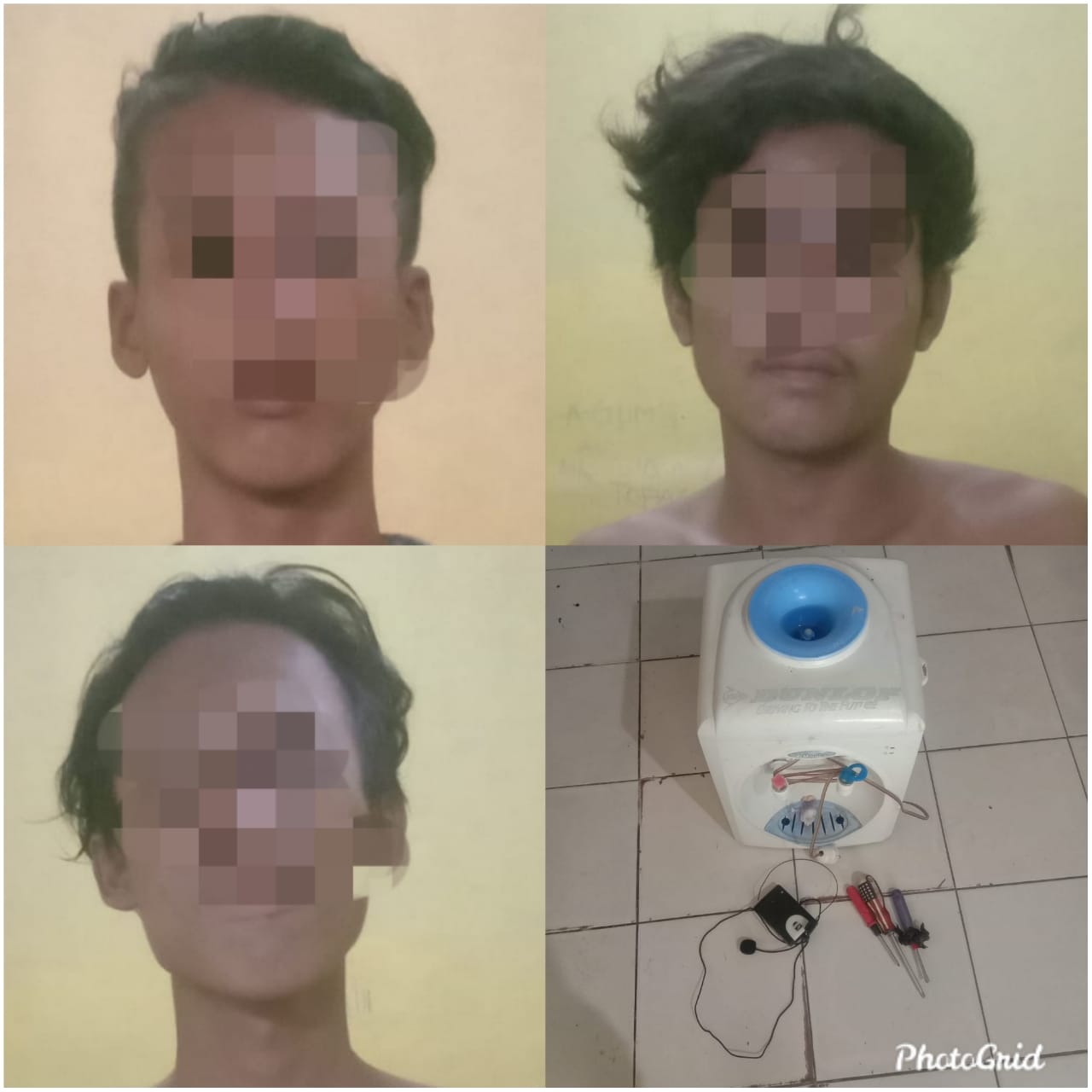 Para pelaku pencurian ini diamankan warga pada Kamis pagi (2/7/2020) disebuah ruko kosong di kawasan Pasar Flamboyan Desa Tanjung Sawit, bersama pelaku didapati barang bukti sebuah Dispenser dan Mic Saku yang dicuri serta sebuah obeng.