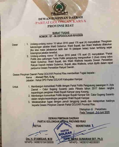 Berikut isi surat tugas dari DPD I Golkar Riau, pertama membangun komunikasi politik dengan partai politik pengusung pasangan H Azis Zainal-Catur Sugeng, pada pilkada tahun 2017 dalam rangka kepentingan pengisian Wakil Bupati Kampar yang kosong.