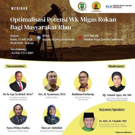 PEKANBARU. RIAUMADANI. COM - Forum Komunikasi Pemuka Masyarakat Riau (FKPMR) bekerjasama dengan Publish What You Pay Indonesia menaja kegiatan Seminar Online (Webinar) dengan tajuk “Optimalisasi Potensi Wilayah Kerja Migas Rokan Bagi Masyarakat Riau” pada Rabu (15/7/20) mulai jam 08.30 WIB.